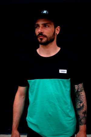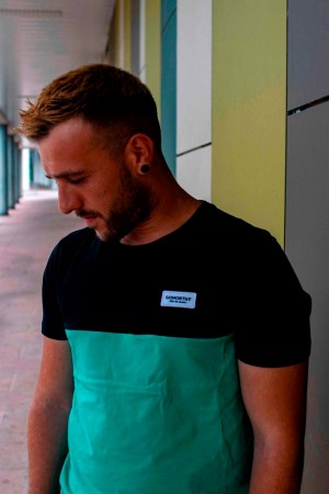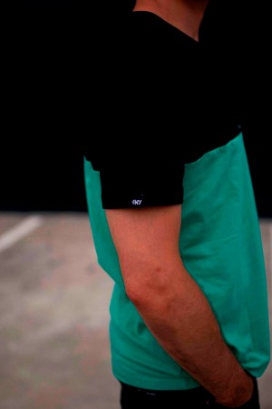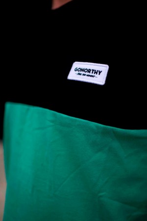 Camiseta GONORTHY Bicolor negra/verde con parche Feel The Moment. Etiqueta GNY en manga derecha.