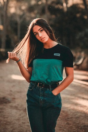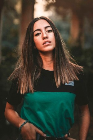 Camiseta GONORTHY Bicolor negra/verde con parche Feel The Moment. Etiqueta GNY en manga derecha.